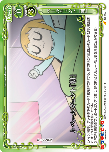 | [メイン/自分]:キャラ1枚を休息状態にする。その後、デッキの下のカード1枚を〔POP〕する。(〔POP〕:裏向きでサポートエリアに置く。〔POP〕されたカードは、表を見ることができる) | ||