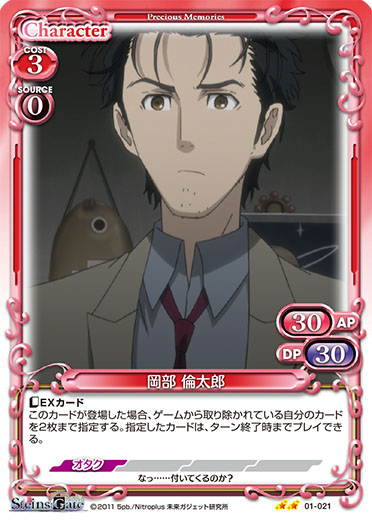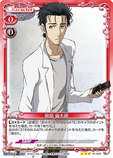 | このカードが登場した場合、EXデッキから『STEINS;GATE』のカード1枚を抜き出し、手札に加える。相手のアプローチによって自分のポイント置き場にカードが置かれた場合、自分の捨て札置き場にあるキャラまたはサポートカード1枚をゲームから取り除くことができる。 | ||