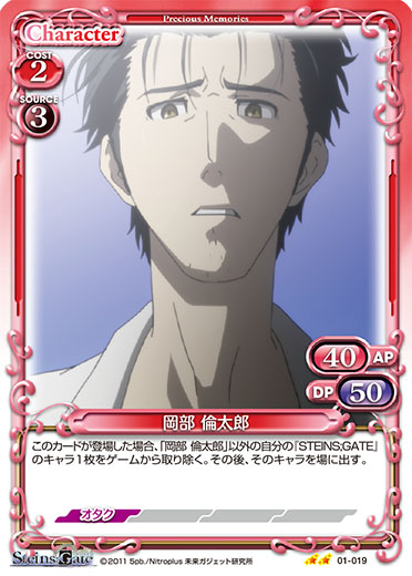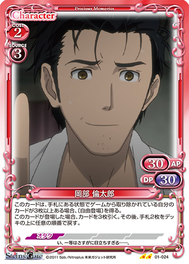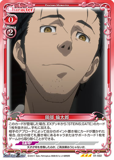 | このカードが登場した場合、「岡部 倫太郎」以外の自分の『STEINS;GATE』のキャラ1枚をゲームから取り除く。その後、そのキャラを場に出す。 | ||