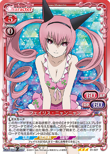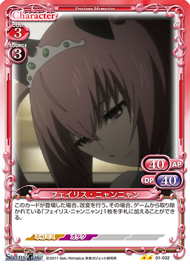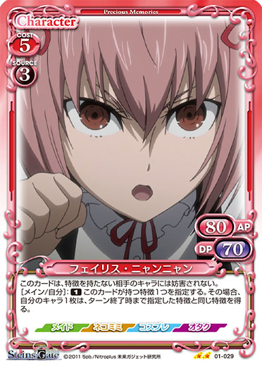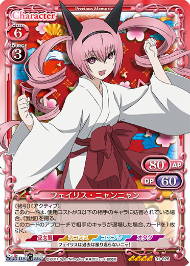 | このカードは、ゲームから取り除かれている状態でもプレイできる。このカードが、自分の「フェイリス・ニャンニャン」がいる状態で登場した場合、カードを1枚引く。 | ||