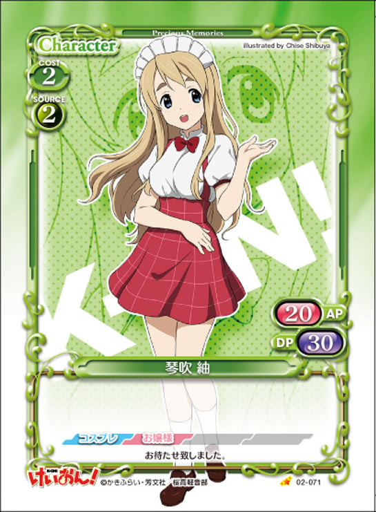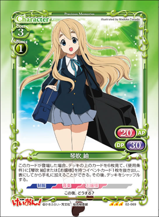 | このカードが登場した場合、デッキの上のカード6枚を見て、《使用条件》に「琴吹 紬」または【お嬢様】を持つイベントカード1枚を抜き出し、表にしてから手札に加えることができる。その後、デッキをシャッフルする。 | ||