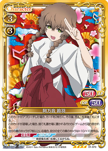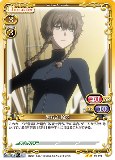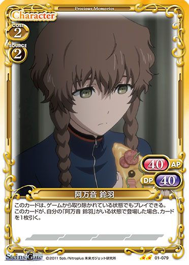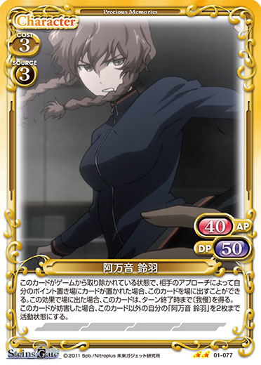 | このカードは、ゲームから取り除かれている状態でもプレイできる。このカードが、自分の「阿万音 鈴羽」がいる状態で登場した場合、カードを1枚引く。 | ||