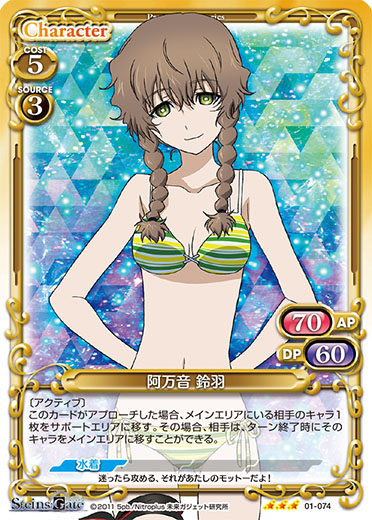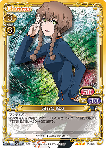 | 〔アクティブ〕自分の「阿万音 鈴羽」がアプローチした場合、このターン、自分の全ての「阿万音 鈴羽」は+20/+20を得る。 | ||