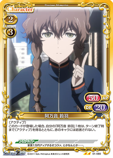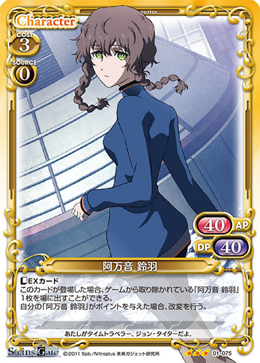 | 〔EXカード〕このカードが登場した場合、ゲームから取り除かれている「阿万音 鈴羽」1枚を場に出すことができる。自分の「阿万音 鈴羽」がポイントを与えた場合、改変を行う。 | ||