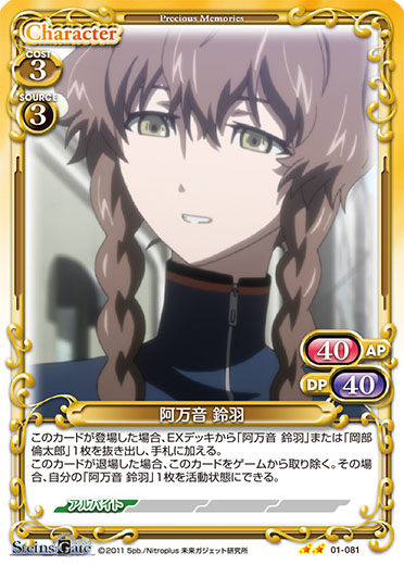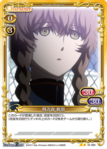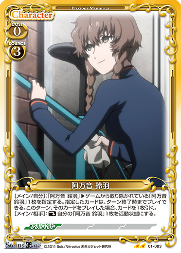 | このカードが登場した場合、EXデッキから「阿万音 鈴羽」または「岡部 倫太郎」1枚を抜き出し、手札に加える。このカードが退場した場合、このカードをゲームから取り除く。その場合、自分の「阿万音 鈴羽」1枚を活動状態にできる。 | ||