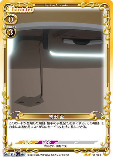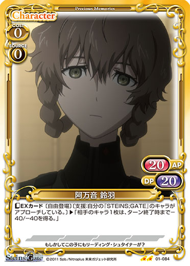 | 〔EXカード〕〔自由登場〕〔支援:自分の『STEINS;GATE』のキャラがアプローチしている。〕▶「相手のキャラ1枚は、ターン終了時まで-40/-40を得る。」 | ||