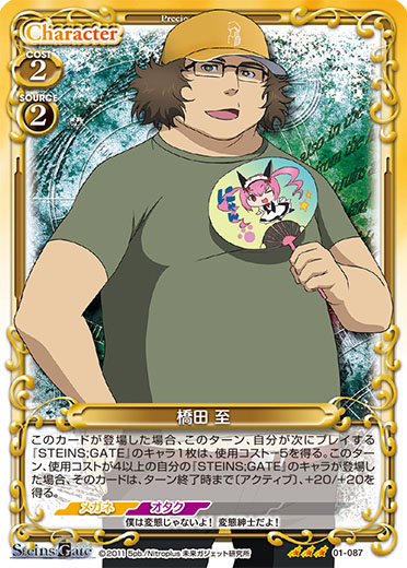 | このカードが登場した場合、このターン、自分が次にプレイする『STEINS;GATE』のキャラ1枚は、使用コスト-5を得る。このターン、使用コストが4以上の自分の『STEINS;GATE』のキャラが登場した場合、そのカードは、ターン終了時まで〔アクティブ〕、+20/+20を得る。 | ||