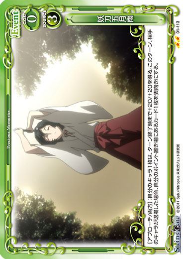 | [メイン/自分]:ゲームから取り除かれている自分のカードを任意の枚数捨て札にする。その場合、使用コストが捨て札にした枚数以下の相手のキャラ1枚を捨て札にする。 | ||