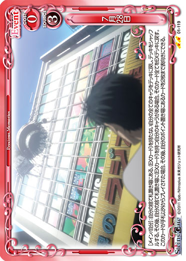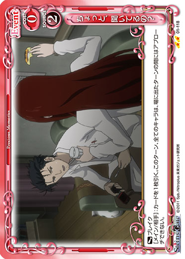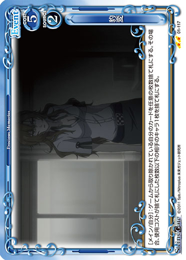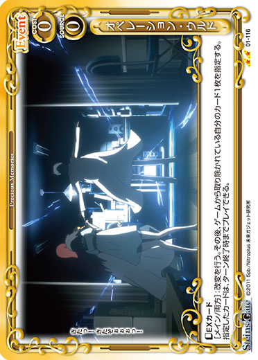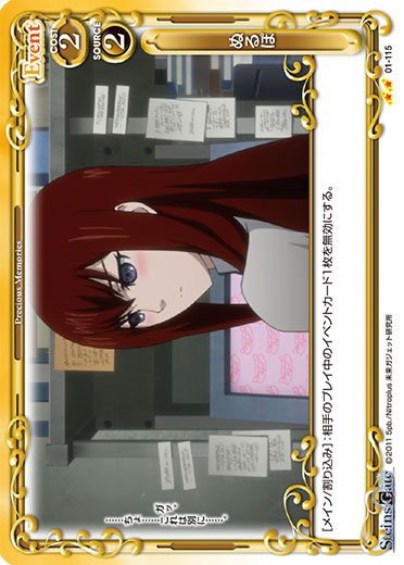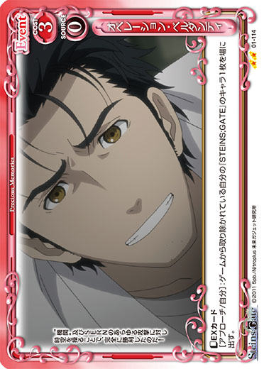 | 〔EXカード〕[アプローチ/自分]:ゲームから取り除かれている自分の『STEINS;GATE』のキャラ1枚を場に出す。 | ||
