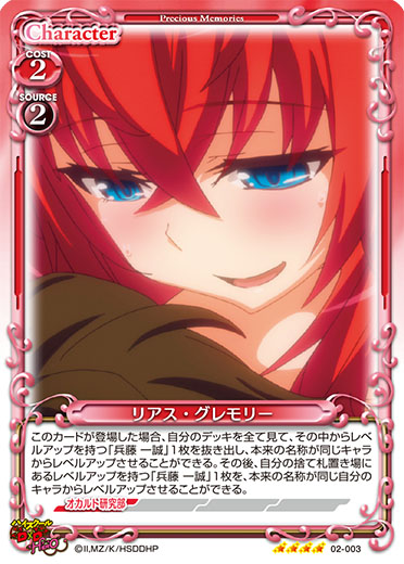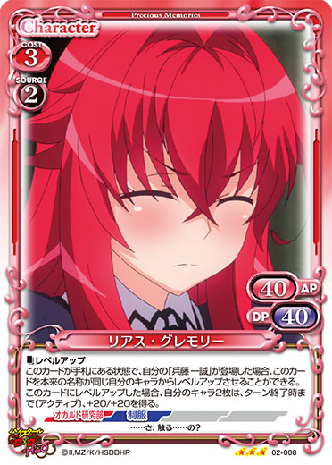 | 〔レベルアップ〕このカードが手札にある状態で、自分の「兵藤 一誠」が登場した場合、このカードを本来の名称が同じ自分のキャラからレベルアップさせることができる。このカードにレベルアップした場合、自分のキャラ2枚は、ターン終了時まで〔アクティブ〕、+20/+20を得る。 | ||