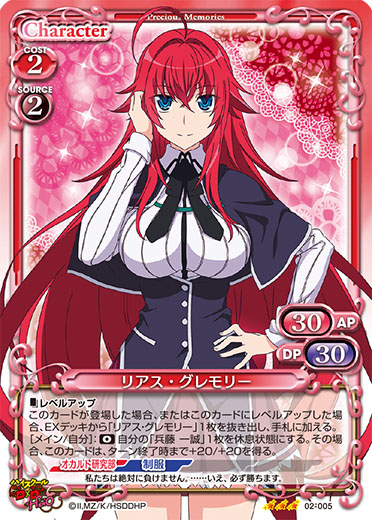 | 自分の『ハイスクールD×D HERO』のキャラがいる状態でこのカードが登場した場合、カードを2枚引く。[メイン/相手]:《休》LV2以上の自分の【オカルト研究部】が2枚以上いる場合、このカードを捨て札にする。その場合、カードを2枚引く。 | ||