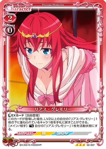 | 〔EXカード〕〔自由登場〕このカードが登場した場合、LV2以上の自分の「リアス・グレモリー」1枚の下に重ねられているキャラ1枚を手札に戻すことができる。[メイン/相手]:《休》自分の「リアス・グレモリー」1枚を活動状態にする。 | ||