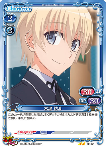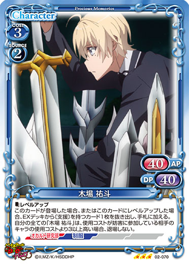 | 〔レベルアップ〕このカードが登場した場合、またはこのカードにレベルアップした場合、EXデッキから〔支援〕を持つカード1枚を抜き出し、手札に加える。自分の全ての「木場 祐斗」は、使用コストが妨害に参加している相手のキャラの使用コストより3以上高い場合、退場しない。 | ||