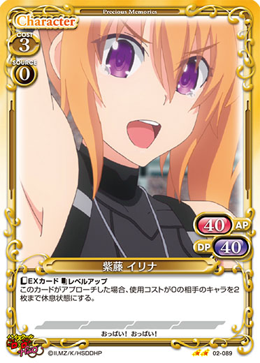 | 自分の「紫藤 イリナ」がレベルアップした場合、カードを1枚引く。自分のカードの効果で相手のキャラが休息状態になるごとに、自分のキャラ1枚は、ターン終了時まで+10/+10を得る。 | ||