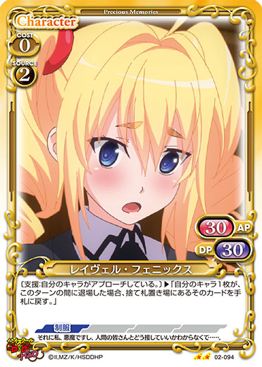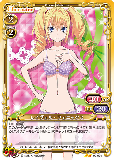 | 〔自由登場〕このカードが登場した場合、ターン終了時に自分の捨て札置き場にある『ハイスクールD×D HERO』のキャラ1枚を手札に戻す。 | ||