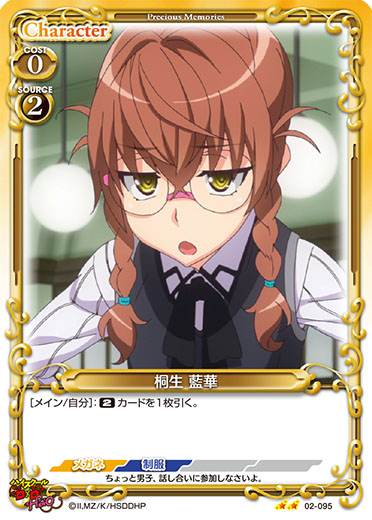 | このカードが登場した場合、EXデッキから「ゼノヴィア」または「紫藤 イリナ」1枚を抜き出し、手札に加える。[メイン/自分]:《0》自分の「兵藤 一誠」1枚を休息状態にする。その場合、このカードは、ターン終了時まで+20/+20を得る。 | ||