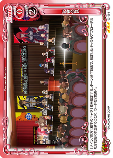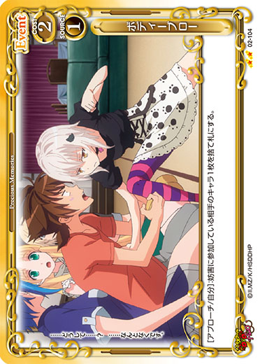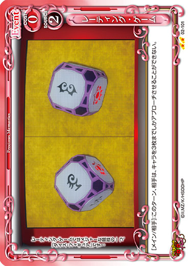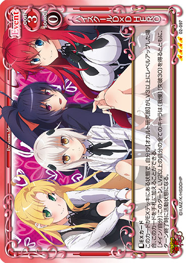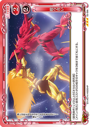 | 《使用条件》:LV2以上の【オカルト研究部】[メイン/両方]:使用コストが0の相手のキャラを3枚まで捨て札にする。 | ||