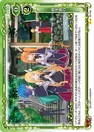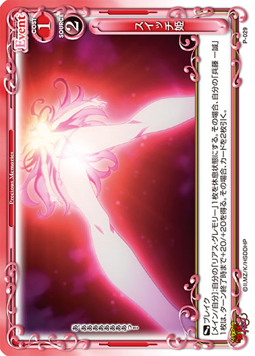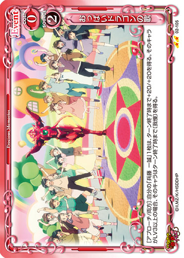 | [アプローチ/自分]:それぞれ名称の異なる自分のキャラ2枚は、ターン終了時まで+20/+20を得るとともに、このターン、このターンの間に場に出た相手のキャラには妨害されない。 | ||