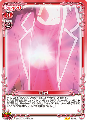 | 手札にある「リアス・グレモリー」は、以下のテキストを得る。「〔支援:「可能性」がセットされているキャラがアプローチしている。〕▶「「可能性」がセットされている自分のキャラ1枚は、ターン終了時まで+50/+50を得るとともに活動状態になる。」」 | ||
