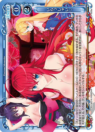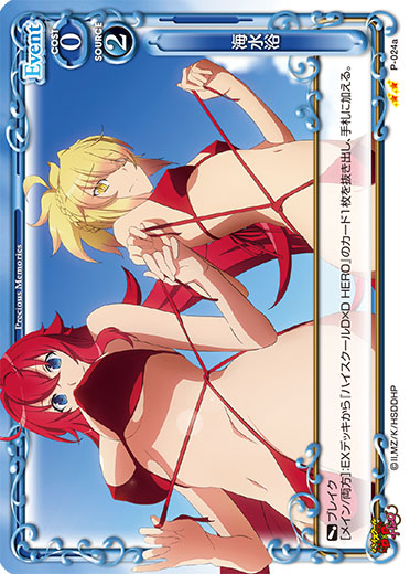 | [メイン/自分]:自分の『ハイスクールD×D HERO』のキャラ1枚を指定する。その場合、デッキの中を全て見て、その中にある指定したキャラと同じ名称のキャラ1枚を抜き出し、表にしてから手札に加える。その後、デッキをシャッフルする。 | ||