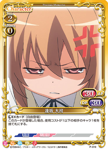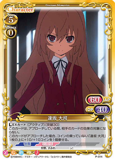 | 〔EXカード〕〔アクティブ〕〔突破30〕このカードは、アプローチしている間、相手のカードの効果の対象にならない。このカードがアプローチした場合、コインの乗っていない「逢坂 大河」1枚の上に+10/+10コインを1個乗せる。 | ||