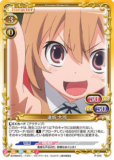 | 〔EXカード〕〔アクティブ〕このカードは、発生コストが1以下のキャラには妨害されない。[アプローチ/自分]:《1》アプローチしている自分の「逢坂 大河」1枚と、そのキャラを妨害している相手のキャラ1枚のDPを0に変更する。 | ||