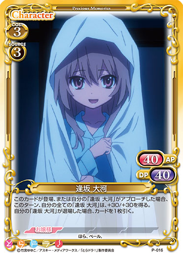 | このカードが登場、または自分の「逢坂 大河」がアプローチした場合、このターン、自分の全ての「逢坂 大河」は、+30/+30を得る。自分の「逢坂 大河」が退場した場合、カードを1枚引く。 | ||