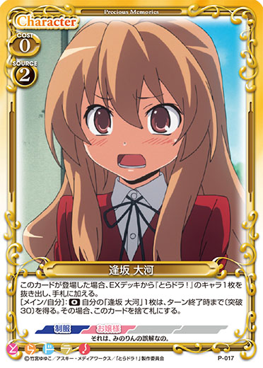 | このカードが登場した場合、EXデッキから『とらドラ!』のキャラ1枚を抜き出し、手札に加える。[メイン/自分]:《0》自分の「逢坂 大河」1枚は、ターン終了時まで〔突破30〕を得る。その場合、このカードを捨て札にする。 | ||