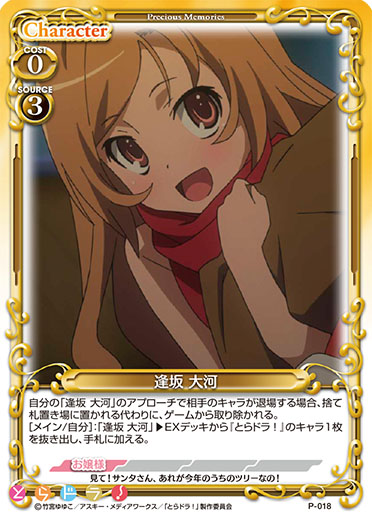 | 自分の「逢坂 大河」のアプローチで相手のキャラが退場する場合、捨て札置き場に置かれる代わりに、ゲームから取り除かれる。 [メイン/自分]:「逢坂 大河」▶EXデッキから『とらドラ!』のキャラ1枚を抜き出し、手札に加える。 | ||