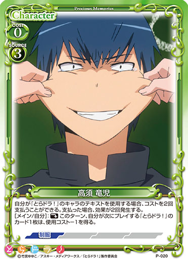 | 自分が『とらドラ!』のキャラのテキストを使用する場合、コストを2回支払うことができる。支払った場合、効果が2回発生する。 [メイン/自分]:《休》このターン、自分が次にプレイする『とらドラ!』のカード1枚は、使用コスト-1を得る。 | ||