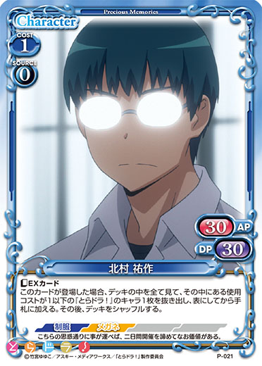 | 〔EXカード〕このカードが登場した場合、デッキの中を全て見て、その中にある使用コストが1以下の『とらドラ!』のキャラ1枚を抜き出し、表にしてから手札に加える。その後、デッキをシャッフルする。 | ||