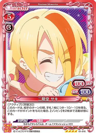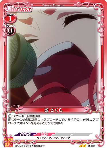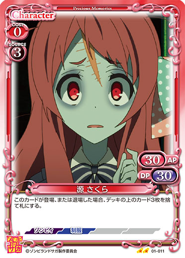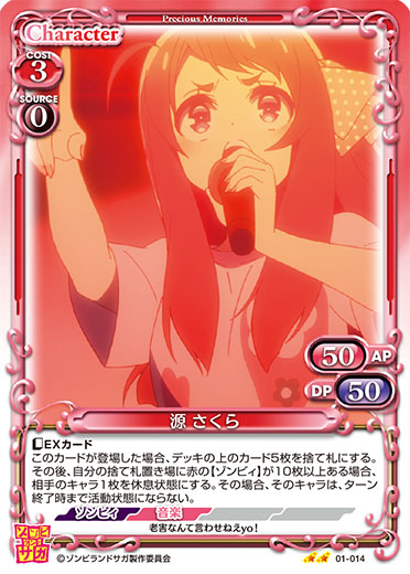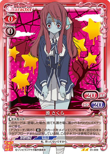 | 〔EXカード〕このカードが登場した場合、デッキの上のカード5枚を捨て札にする。その後、自分の捨て札置き場に赤の【ゾンビィ】が10枚以上ある場合、相手のキャラ1枚を休息状態にする。その場合、そのキャラは、ターン終了時まで活動状態にならない。 | ||