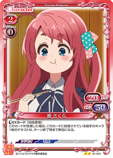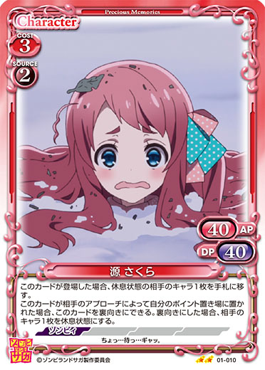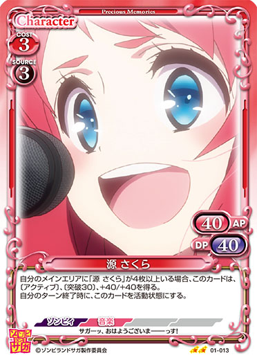 | 自分のメインエリアに「源 さくら」が4枚以上いる場合、このカードは、〔アクティブ〕、〔突破30〕、+40/+40を得る。自分のターン終了時に、このカードを活動状態にする。 | ||