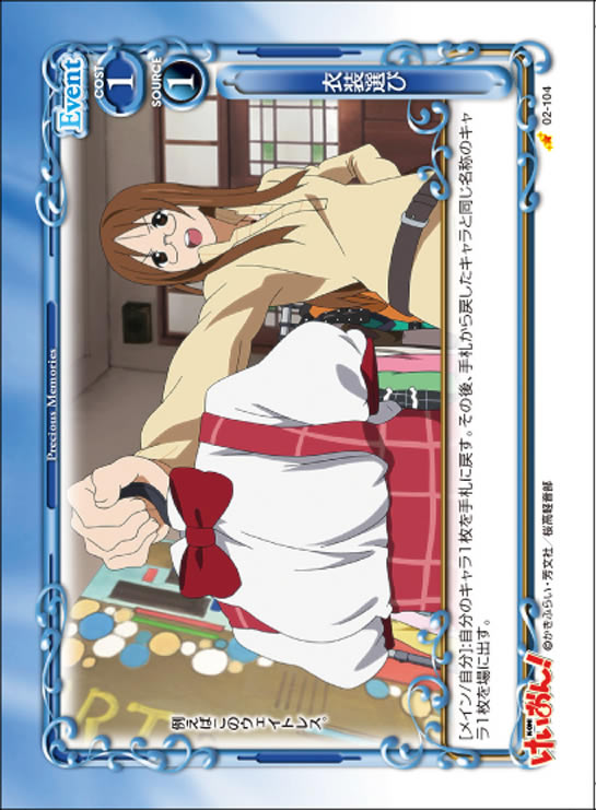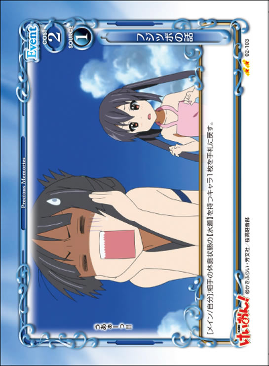 | [メイン/自分]:相手の休息状態の【水着】を持つキャラ1枚を手札に戻す。 | ||