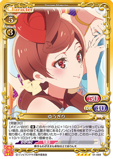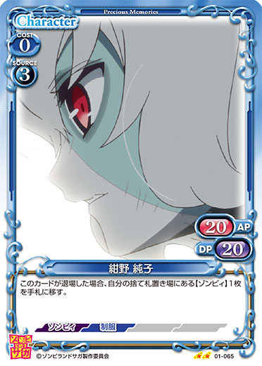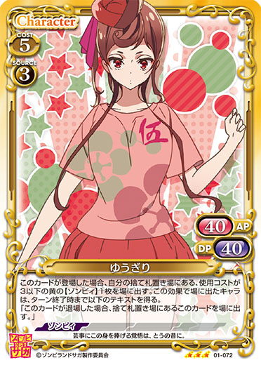| このカードが登場した場合、自分の捨て札置き場にある、使用コストが3以下の黄の【ゾンビィ】1枚を場に出す。この効果で場に出たキャラは、ターン終了時まで以下のテキストを得る。「このカードが退場した場合、捨て札置き場にあるこのカードを場に出す。」 | ||