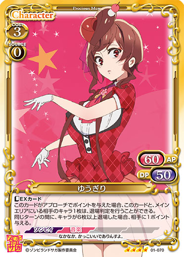 | 〔EXカード〕このカードがアプローチでポイントを与えた場合、このカードと、メインエリアにいる相手のキャラ1枚は、退場判定を行うことができる。同じターンの間に、キャラが6枚以上退場した場合、相手に1ポイント与える。 | ||
