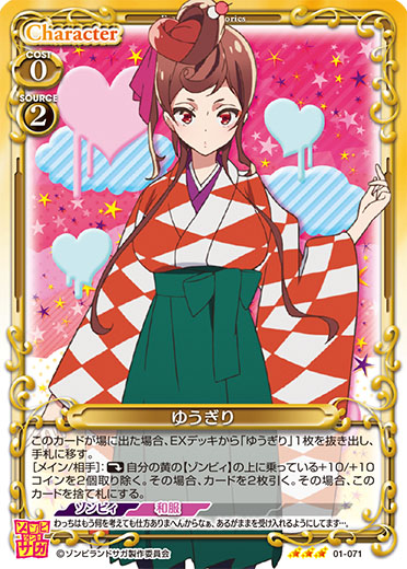 | このカードが場に出た場合、EXデッキから「ゆうぎり」1枚を抜き出し、手札に移す。[メイン/相手]:《休》自分の黄の【ゾンビィ】の上に乗っている+10/+10コインを2個取り除く。その場合、カードを2枚引く。その場合、このカードを捨て札にする。 | ||