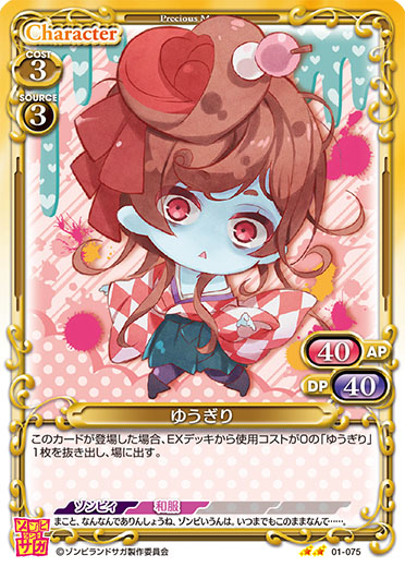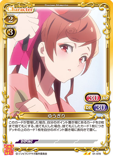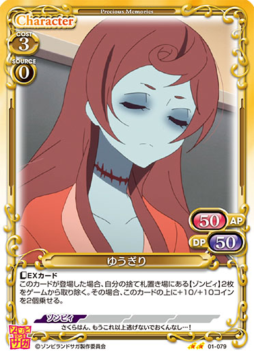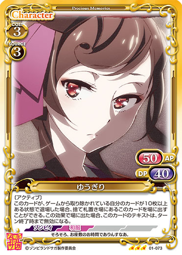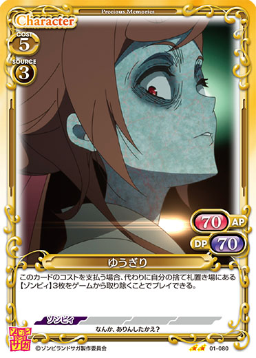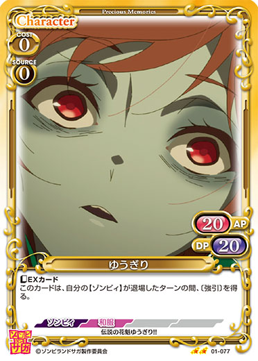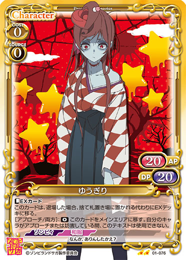 | このカードが登場した場合、自分の「ゆうぎり」1枚を休息状態にする。その場合、カードを1枚引く。または、EXデッキから『ゾンビランドサガ』のカード1枚を抜き出し、手札に移す。 | ||