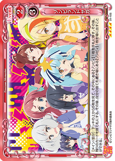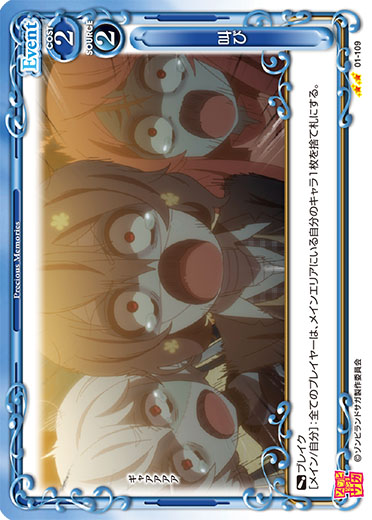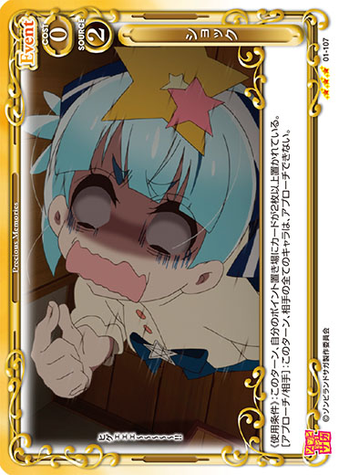 | 《使用条件》:このターン、自分のポイント置き場にカードが2枚以上置かれている。[アプローチ/相手]:このターン、相手の全てのキャラは、アプローチできない。 | ||