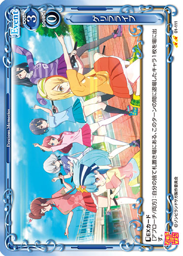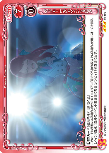 | 〔EXカード〕[アプローチ/両方]:自分の捨て札置き場にある、このターンの間に退場したキャラ1枚を場に出す。 | ||