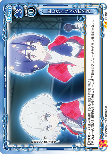 | 〔EXカード〕《使用条件》:「水野 愛」+「紺野 純子」[アプローチ/両方]:相手のキャラ1枚は、ターン終了時までアプローチと妨害に参加できない。 | ||