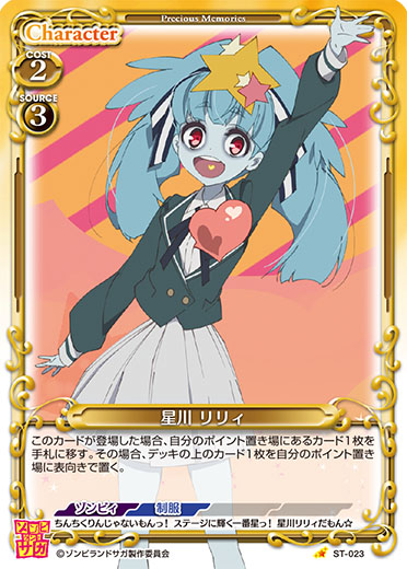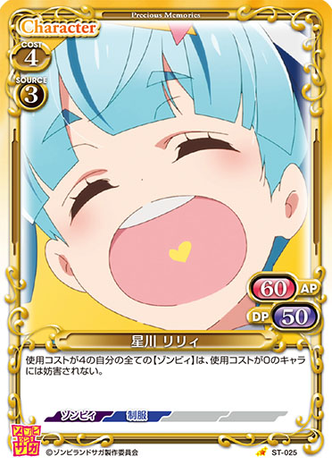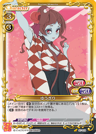 | [メイン/自分]:《0》自分のポイント置き場にある【ゾンビィ】1枚は、ターン終了時まで発生コスト+1を得る。(《0》:宣言のみでテキストを使用できる。) | ||