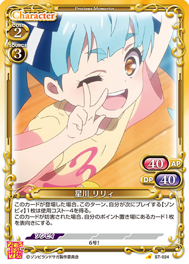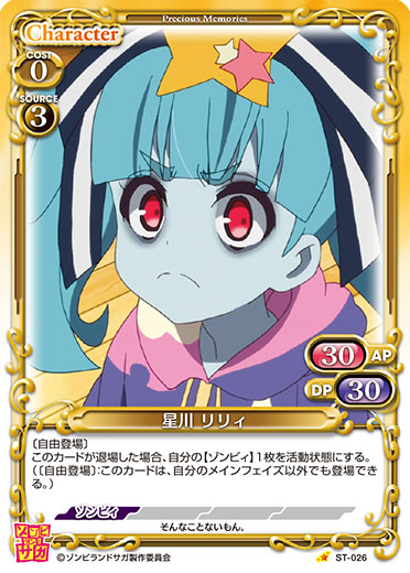 | 〔自由登場〕このカードが退場した場合、自分の【ゾンビィ】1枚を活動状態にする。(〔自由登場〕:このカードは、自分のメインフェイズ以外でも登場できる。) | ||