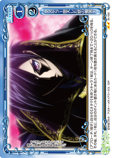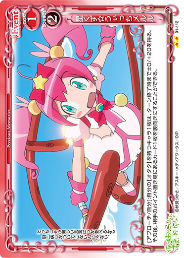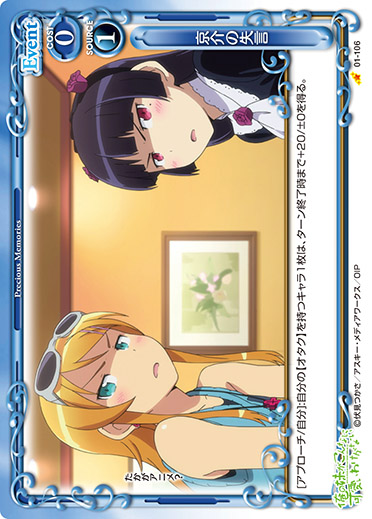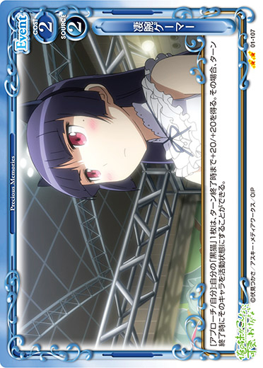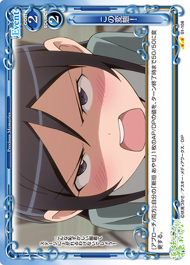 | [アプローチ/自分]:自分の【オタク】を持つキャラ1枚は、ターン終了時まで±0/+20を得る。その後、相手のポイント置き場にあるカード1枚を裏向きにすることができる。 | ||