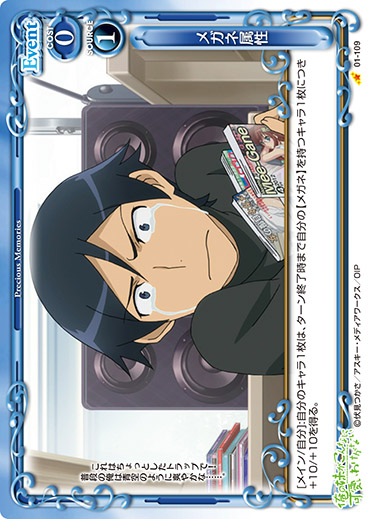| [メイン/自分]:自分のキャラ1枚は、ターン終了時まで自分の【メガネ】を持つキャラ1枚につき+10/+10を得る。 | ||