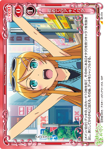 | [メイン/自分]:デッキの上のカード10枚を見て、その中にある【オタク】を持つキャラ1枚を抜き出し、表にしてから手札に加える。その後、デッキをシャッフルする。 | ||