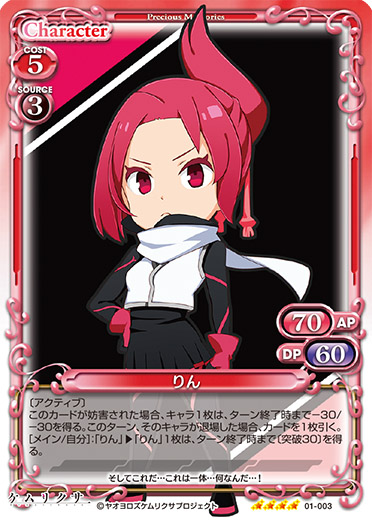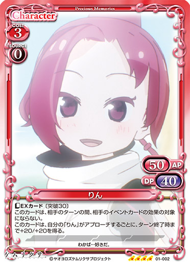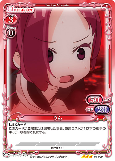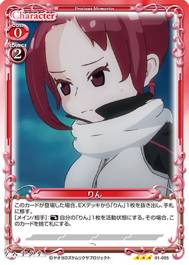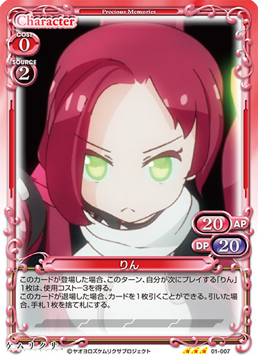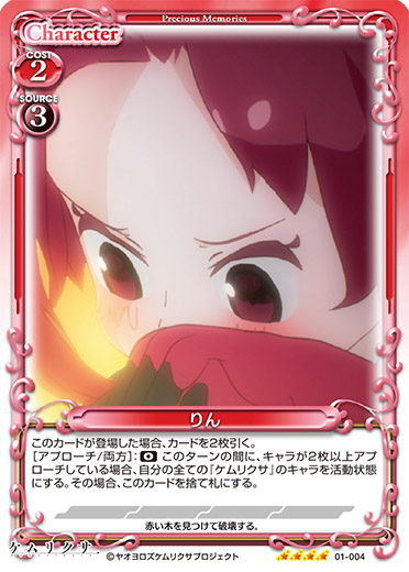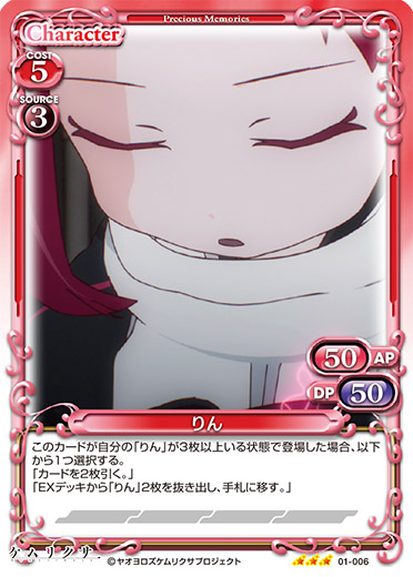 | このカードが登場した場合、このターン、自分が次にプレイする「りん」1枚は、使用コスト-3を得る。このカードが退場した場合、カードを1枚引くことができる。引いた場合、手札1枚を捨て札にする。 | ||