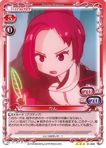 | 〔EXカード〕〔アクティブ〕このカードは、相手の赤のカードの効果の対象にならない。[メイン/自分]:「りん」▶相手のキャラ1枚を指定する。このターン、指定されたキャラと同じ名称の全てのキャラの色は、赤としても扱う。 | ||