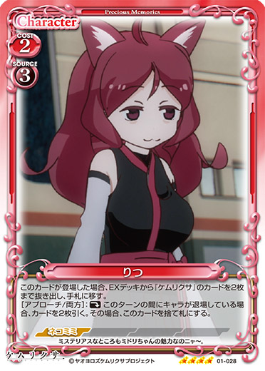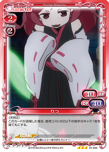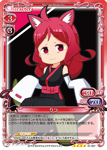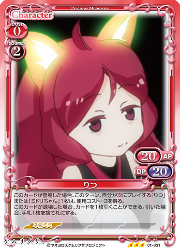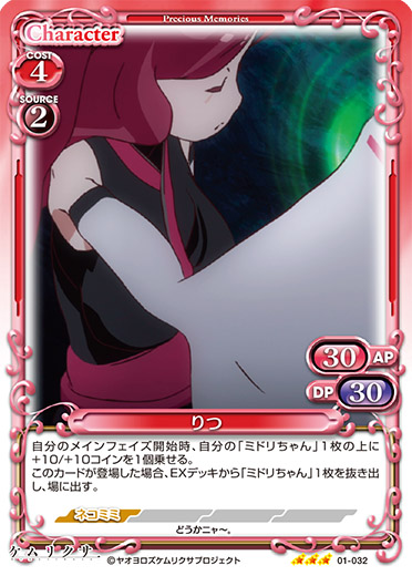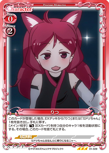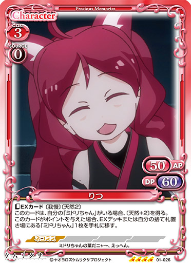| このカードが登場した場合、このターン、自分が次にプレイする「りつ」または「ミドリちゃん」1枚は、使用コスト-3を得る。このカードが退場した場合、カードを1枚引くことができる。引いた場合、手札1枚を捨て札にする。 | ||