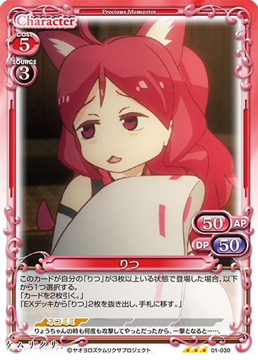| このカードが自分の「りつ」が3枚以上いる状態で登場した場合、以下から1つ選択する。「カードを2枚引く。」「EXデッキから「りつ」2枚を抜き出し、手札に移す。」 | ||